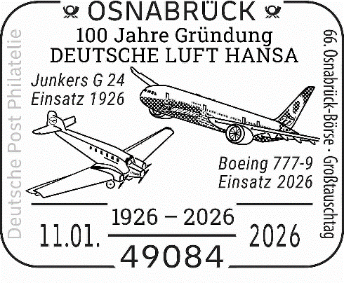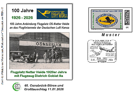 Die Deutsche Post ist mit ihrem „Event-Team-Philatelie“ vor Ort und freut sich auf ihren Besuch. Diesmal wurde ein Sonderstempel aufgelegt, der auch einen besonderen Bezug zur Stadt Osnabrück aufweist: 100 Jahre Luft Hansa. (Anm.d.Red.: Nicht nur auf dem Stempel, sondern auch auf den noch folgenden Belegen und der Marken Individuell verwenden wir die damals übliche Bezeichnung (Deutsche) Luft Hansa . Die Deutsche Lufthansa AG, wie dieses Unternehmen heute richtig heißt, gibt es erst seit 1953). Osnabrück war mit seinem Flugplatz Netter Heide von 1926 bis 1935 in das Flugliniennetz eingebunden. Hier steht bis heute die älteste, denkmalgeschützte Flugzeughalle Deutschlands.